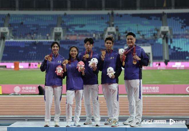 11月16日晚,十五運(yùn)會(huì)田徑比賽4×100米混合接力舉行頒獎(jiǎng)儀式。