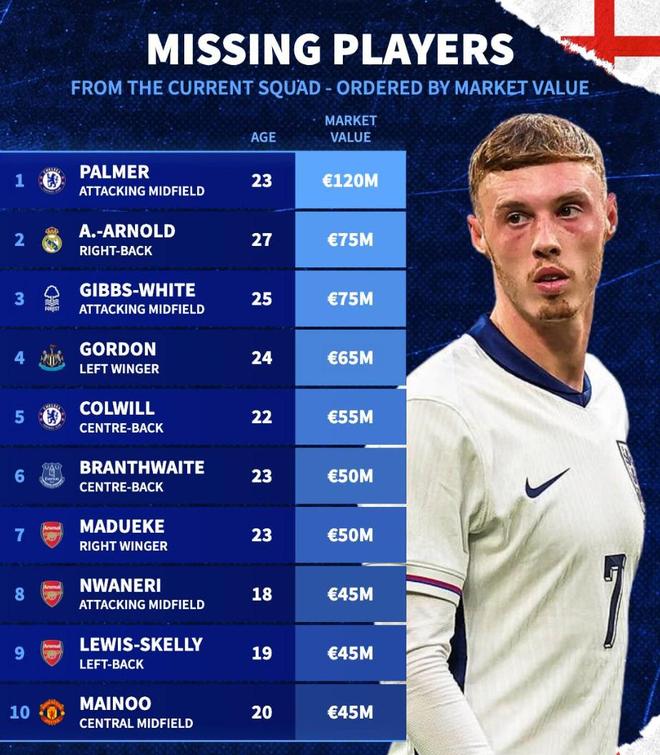北京時(shí)間11月17日,在英格蘭以7戰(zhàn)全勝,打進(jìn)22球0丟球的成績(jī)挺進(jìn)2026年美加墨世界杯之后,德轉(zhuǎn)列出了此次未入選英格蘭代表身價(jià)排名前10的球員,身價(jià)達(dá)到1.2億歐元的帕爾默排名第一,亞歷山大-阿諾德和吉布斯-懷特7500萬(wàn)歐元并列第二。